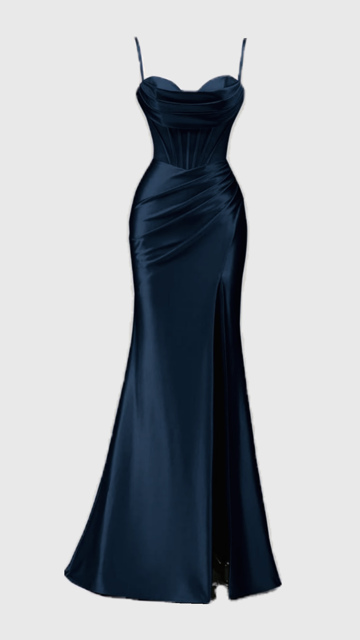 Derin saks mavisi tonuyla güçlü bir şıklık sunan bu uzun abiye, akıcı silueti ve zarif detaylarıyla gecenin en dikkat çekici görünümünü yaratır.